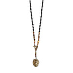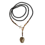 Designed using hematite, onyx, lava stone, oxidized antique bronze cast pendant, and silver.